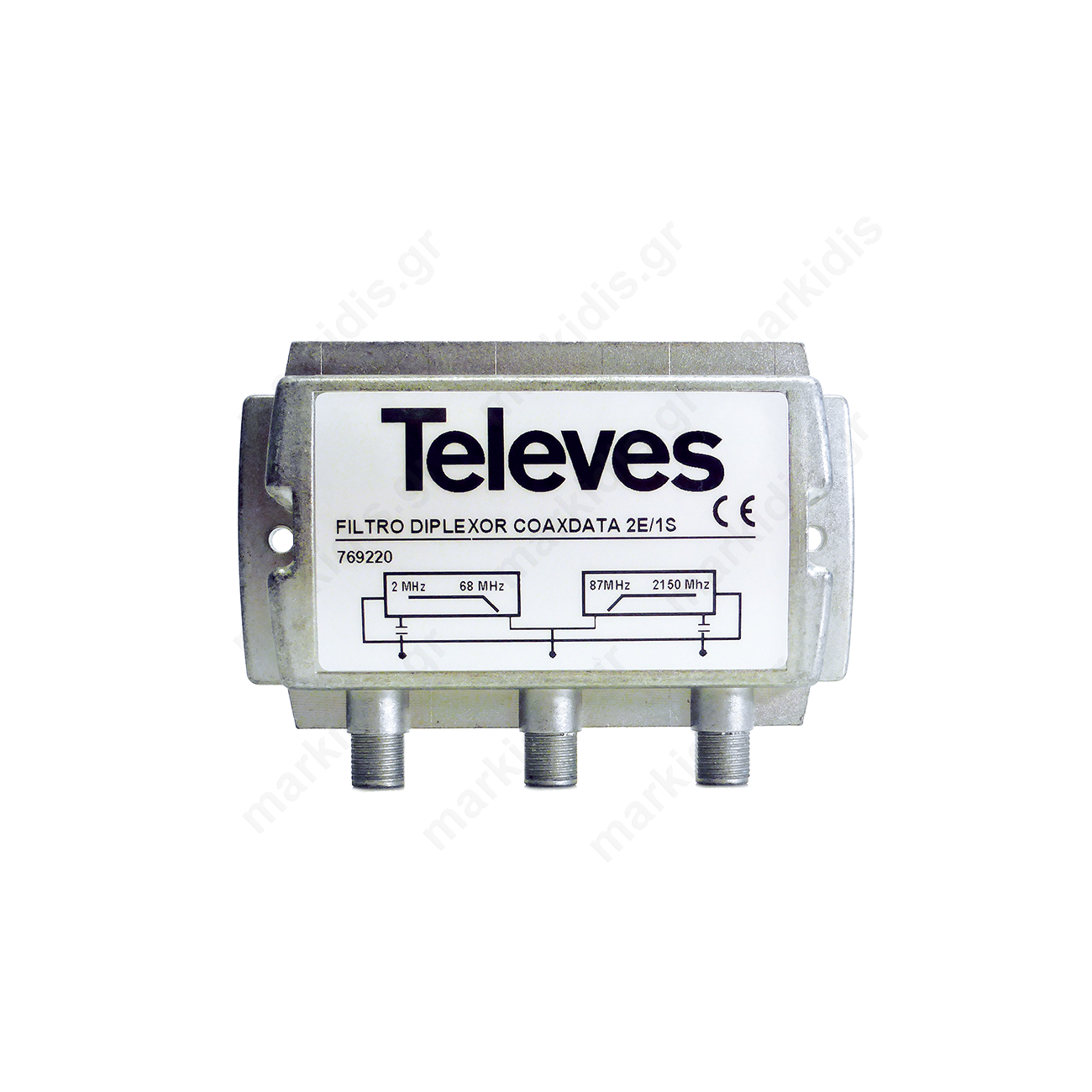 Το Televes 769220 είναι φίλτρο diplexer για μίξη ομοαξονικού απο σύστημα Televes CoaxData μαζί με ομοαξονικό με RF. Είναι απαραίτητο για την αποφυγή παρεμβολών οι οποίες μπορεί να προκληθούν απο το RF και να επηρεάσουν τα Data στο Return Path, τα οποία θα μεταφέρονται με το ίδιο ομοαξονικό καλώδιο, για την επικοινωνία των master/slave μονάδων του δικτύου Coaxdata. To φίλτρο-diplexer 769220 εξαλείφει κάθε τέτοια παρεμβολή και παρέχει απροβλημάτιστη επικοινωνία μεταχύ των συσκευών του δικτύου CoaxData.Τεχνικά χαρακτηριστικά: